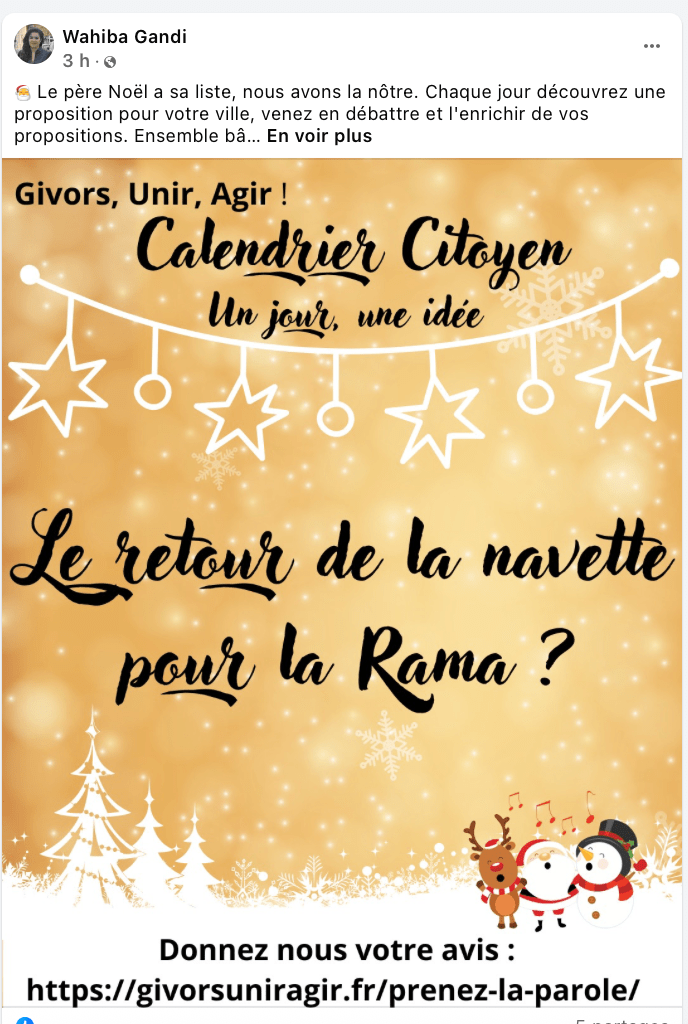 Nous n’en sommes qu’à la quatrième mouture du Calendrier citoyen de la candidate du PC. Si l’idée de Wahiba Gandi est intéressante les propositions le sont moins. En fait elle nous ramène aux actions passées des élu(es) communistes, battues aux municipales de 2020 et 2021. A la question « Le retour de la navette pour la Rama ? pourquoi répondre non à priori. Sauf que celle-ci avait un coût et ne concernait que très peu de familles. De plus elle pouvait être prise comme une mesure injuste. Chaque mercredi des habitants du Drevet, des Cornets ou autres quartiers pas forcément desservis par les transports en commun emmènent leurs enfants pour des activités à Givors, ou dans des villages des alentours. Or, il n’est pas possible de mettre autant de navettes que de cas différents.