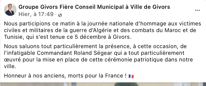 Pour qui suit les candidats, les colistiers, les soutiens et la politique de notre ville ce commentaire doit interpeller. D’ailleurs le silence ou presque de Fabrice Riva nous étonne. Quelques lignes sur cette commémoration. Pas le moindre mot polémique. Pour un événement concernant l’Algérie.