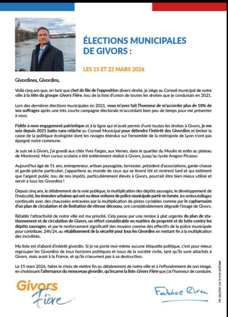 Le candidat Riva dresse un bilan sombre de la Ville et fustige les écologistes. Il souhaite rétablir l’attractivité de la ville. Il n’attaque à aucun moment le maire pas plus que les deux autres candidats. Il indique qu’il n’est pas encarté et souhaite « regrouper les Givordins de tous horizons politiques et issus de la société civile ».
