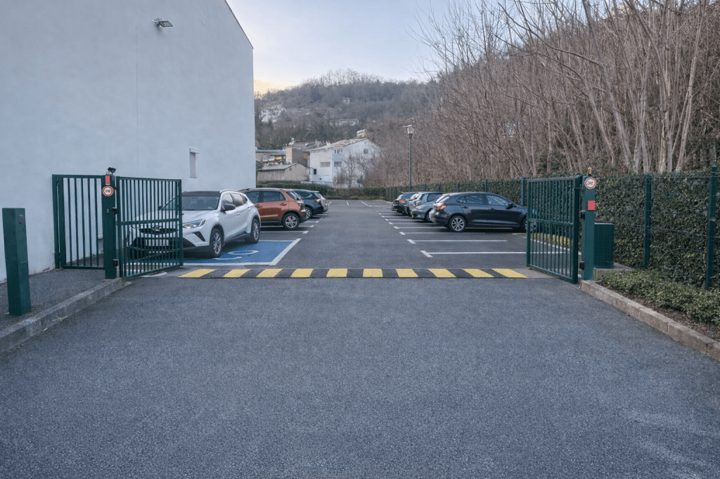 Photo générée par IA. En fait les places seraient plus au fond. Un bel espace existe. Ça plus un parking payant pur des rotations de 45 minutes devant la mairie. En quelques jours nous proposons deux projets qui semblent réalisables.