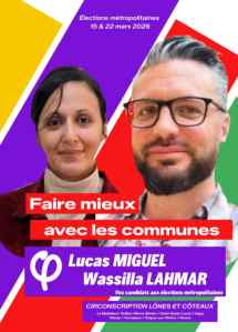 Lucas Miguel, 41 ans, natif et habitant de Charly, ayant des origines du côté maternel depuis le XVIe siècle. Élu conseiller municipal à Charly dans le groupe minoritaire Charly Naturellement. Également élu représentant du personnel à l’hôpital Lyon-Sud (CGT) il travaille de nuit dans un service de chirurgie comme aide-soignant. Ancien responsable et président associatif durant plus de 15 ans pour l’association Charly Patrimoine aujourd’hui dissout. à Charly, dans le secteur de la culture et du patrimoine. Ses thèmes de prédilection : santé, santé environnementale (notamment les PFAS), eau, agroécologie /alimentation. Centres d’intérêts : Histoire, art, littérature, philosophie et voyages.
